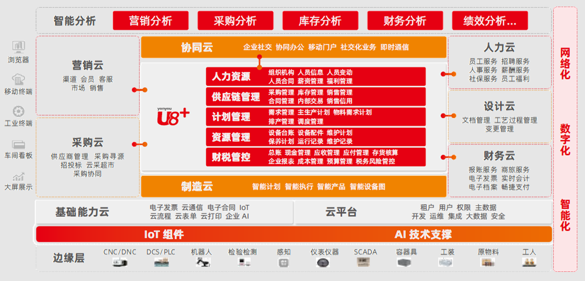 在企業(yè)上云的大趨勢(shì)下,U8+ 全面轉(zhuǎn)向互聯(lián)網(wǎng)方向,深入融合云應(yīng)用,一站式提供財(cái)務(wù)、營(yíng)銷(xiāo)、制造、采購(gòu)、設(shè)計(jì)、協(xié)同、人力等領(lǐng)域的“端 + 云”服務(wù),并通過(guò)軟硬一體化、產(chǎn)業(yè)鏈協(xié)同的策略全面賦能成長(zhǎng)型企業(yè)在技術(shù)、供應(yīng)鏈、生產(chǎn)、財(cái)稅、營(yíng)銷(xiāo)等領(lǐng)域的創(chuàng)新升級(jí)。為成長(zhǎng)型企業(yè)提供基于互聯(lián)網(wǎng)的業(yè)務(wù)協(xié)同、網(wǎng)絡(luò)交易、智慧運(yùn)營(yíng)的全新平臺(tái)。