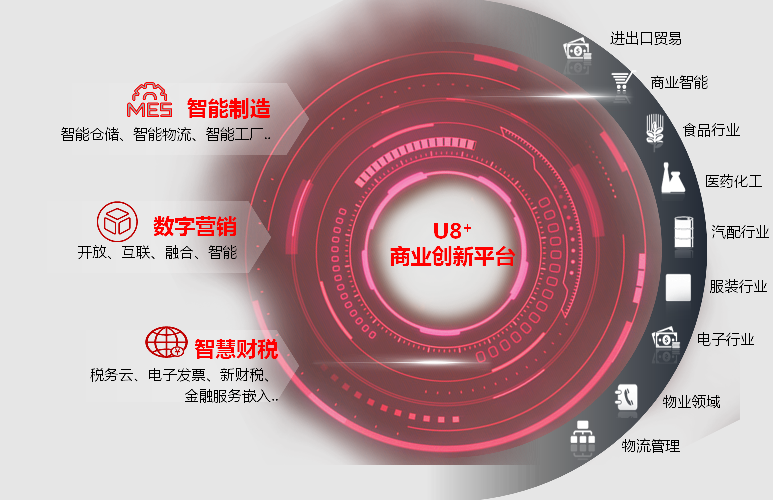 U8+商業(yè)創(chuàng)新平臺(tái)聚焦智能制造、數(shù)字營(yíng)銷(xiāo)和智慧財(cái)稅三大領(lǐng)域,結(jié)合機(jī)械/電子/汽配/服裝/醫(yī)藥/化工/食品/流通/物流/物業(yè)十大行業(yè)應(yīng)用特點(diǎn),為成長(zhǎng)型企業(yè)數(shù)智化升級(jí)提供一站式解決方案。