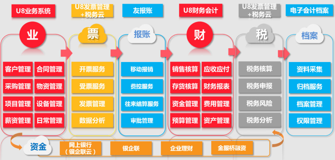 面對(duì)財(cái)稅新政要求,用友U8+全新的財(cái)稅一體化解決方案作為企業(yè)互聯(lián)網(wǎng)時(shí)代的產(chǎn)物,在原有財(cái)務(wù)業(yè)務(wù)管理的基礎(chǔ)之上,為企業(yè)提供費(fèi)用報(bào)銷(xiāo)、電子發(fā)票管理、電子會(huì)計(jì)檔案、銀企聯(lián)云支付、移動(dòng)應(yīng)用等,幫助企業(yè)快速跟上互聯(lián)網(wǎng)時(shí)代的步伐,提升企業(yè)競(jìng)爭(zhēng)力。